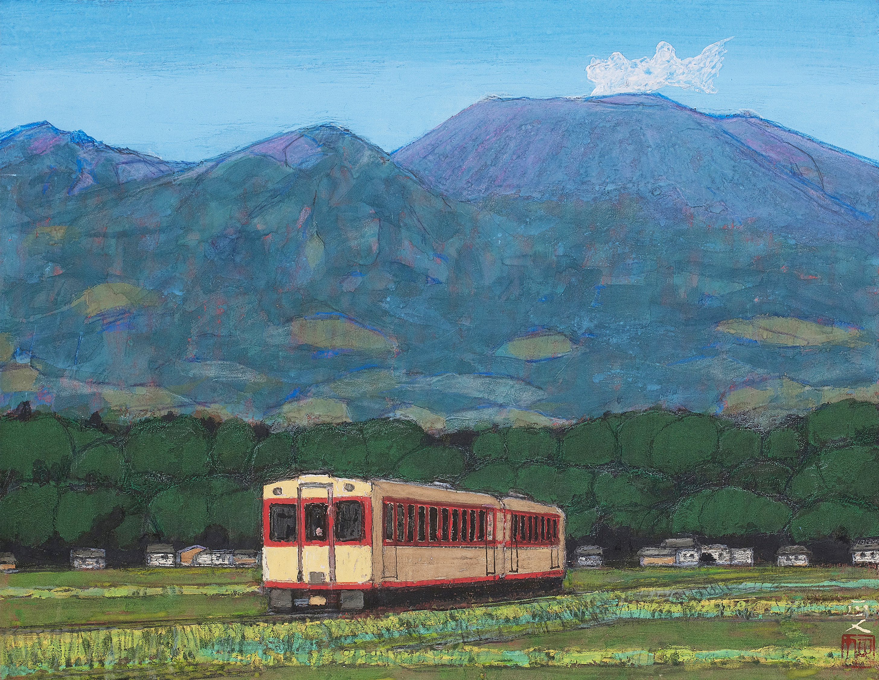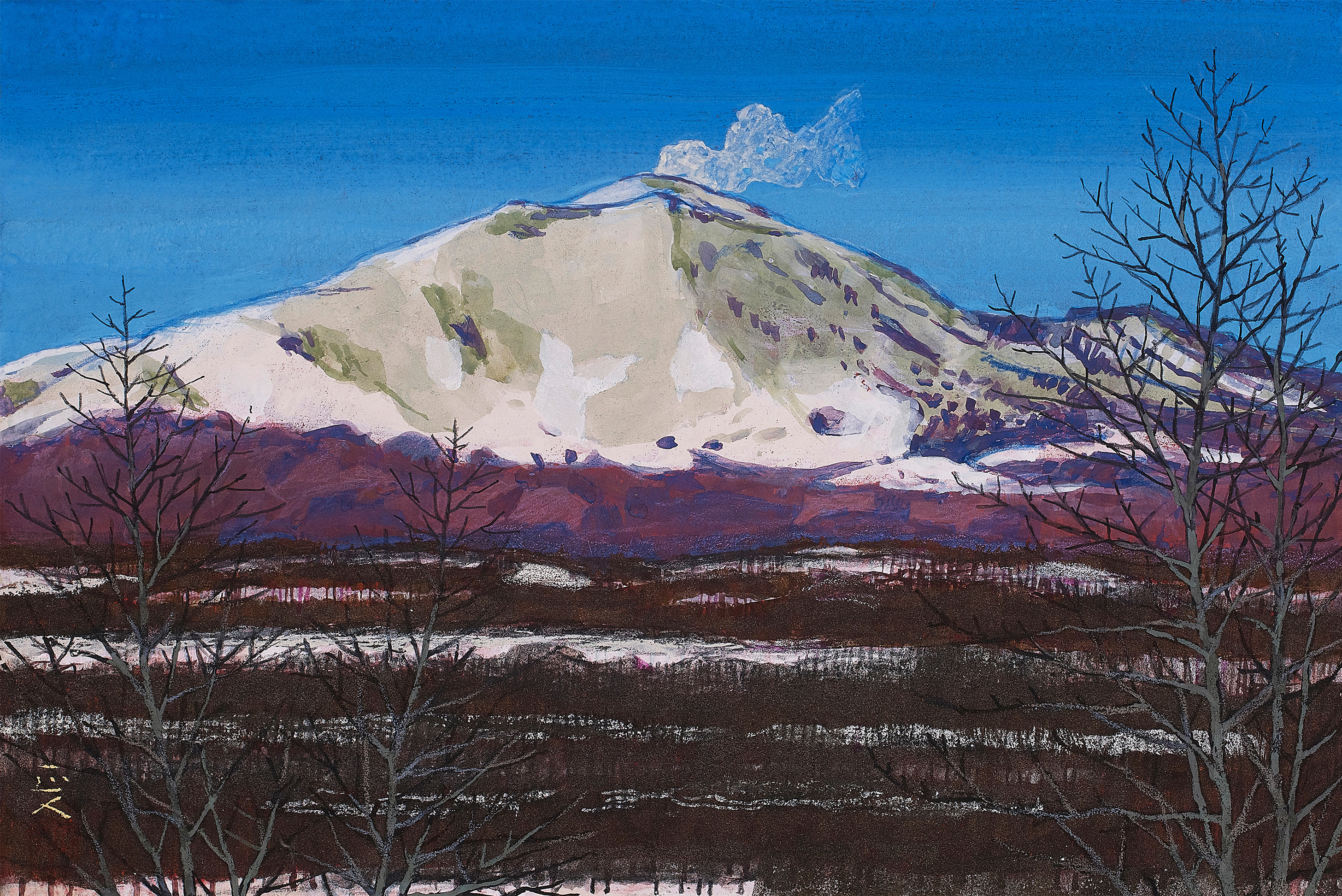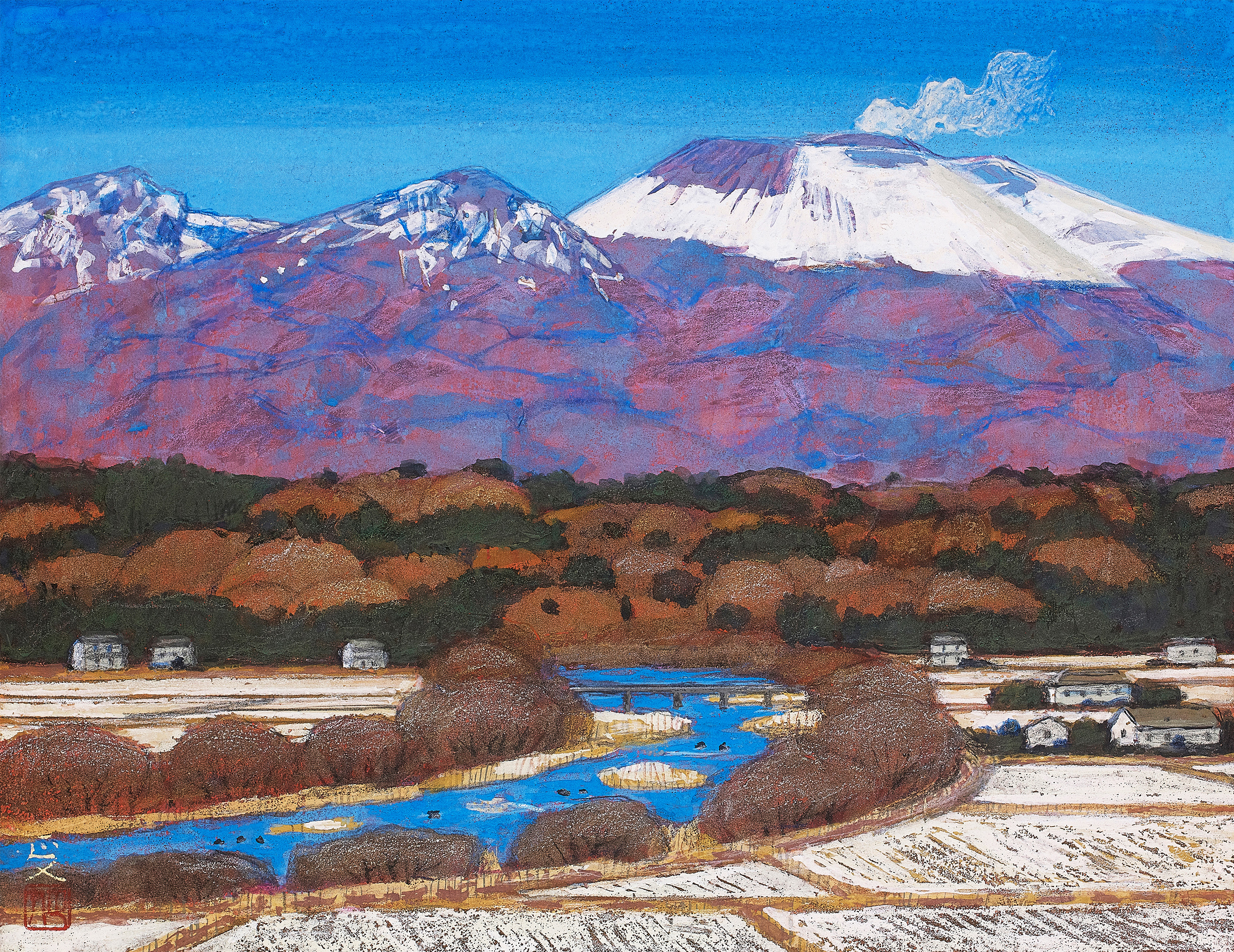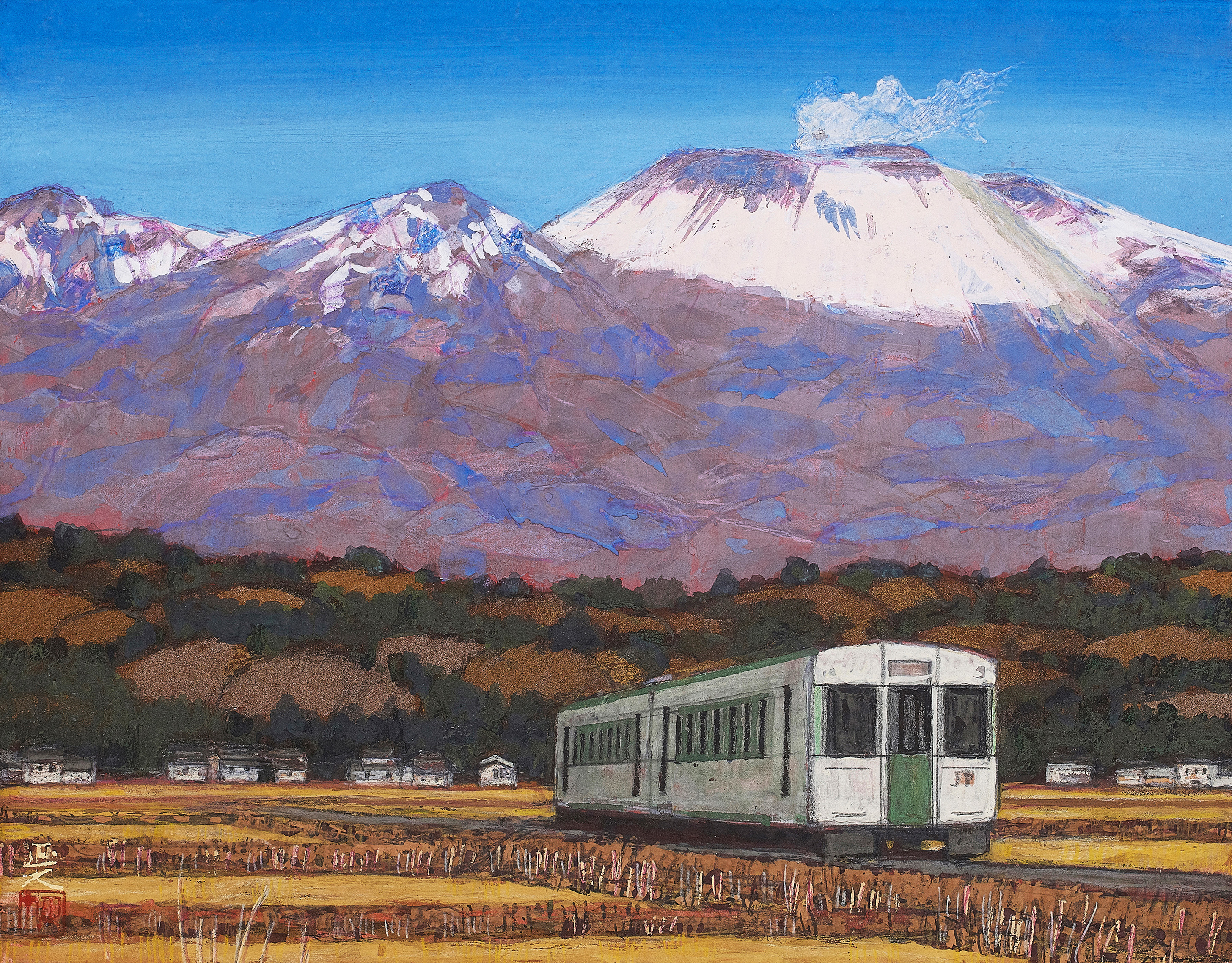 春夏秋冬という季節の移ろい、自然の中に聳える浅間山を描くと同時に風景と人々の営みが描かれている。