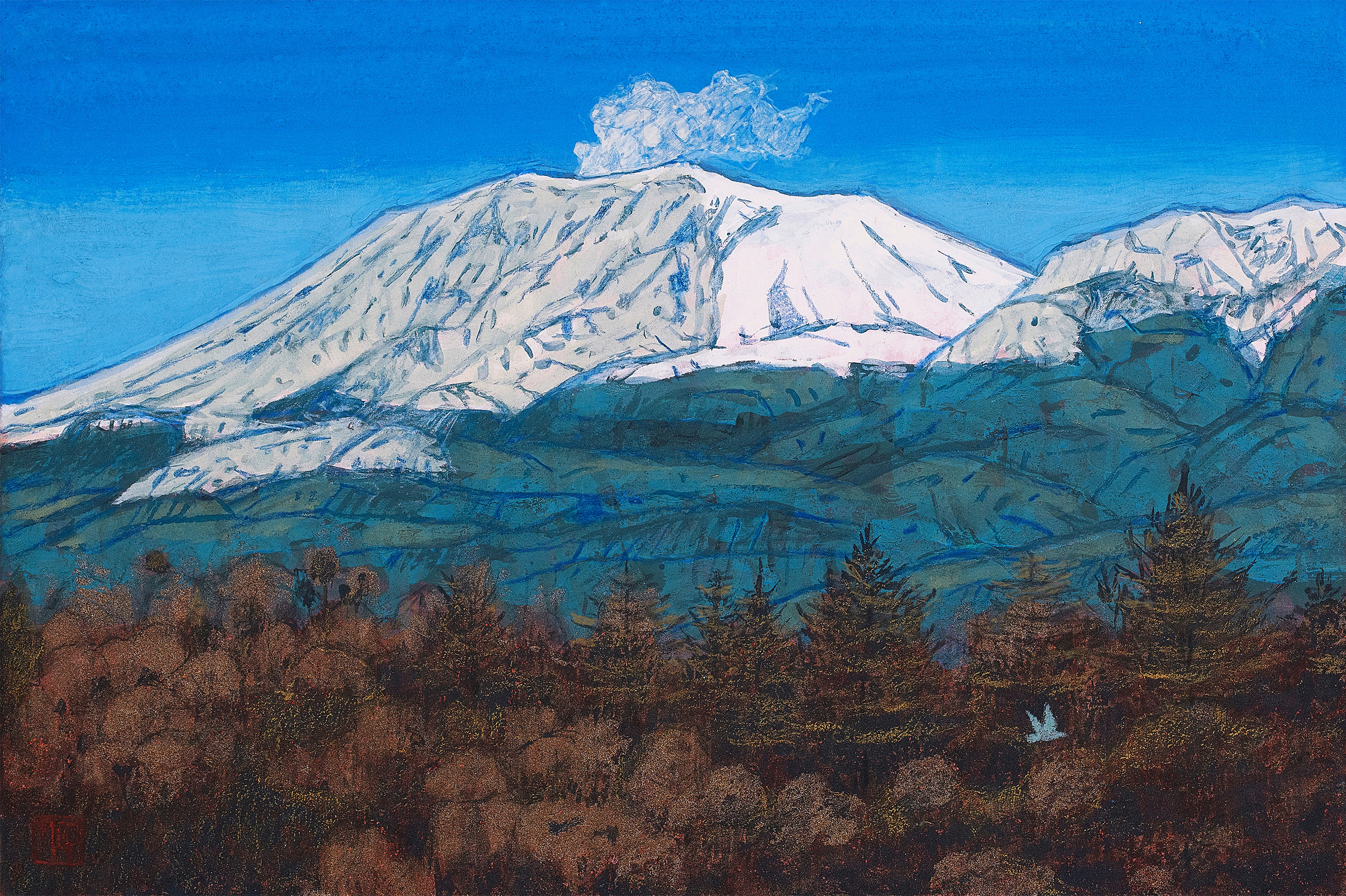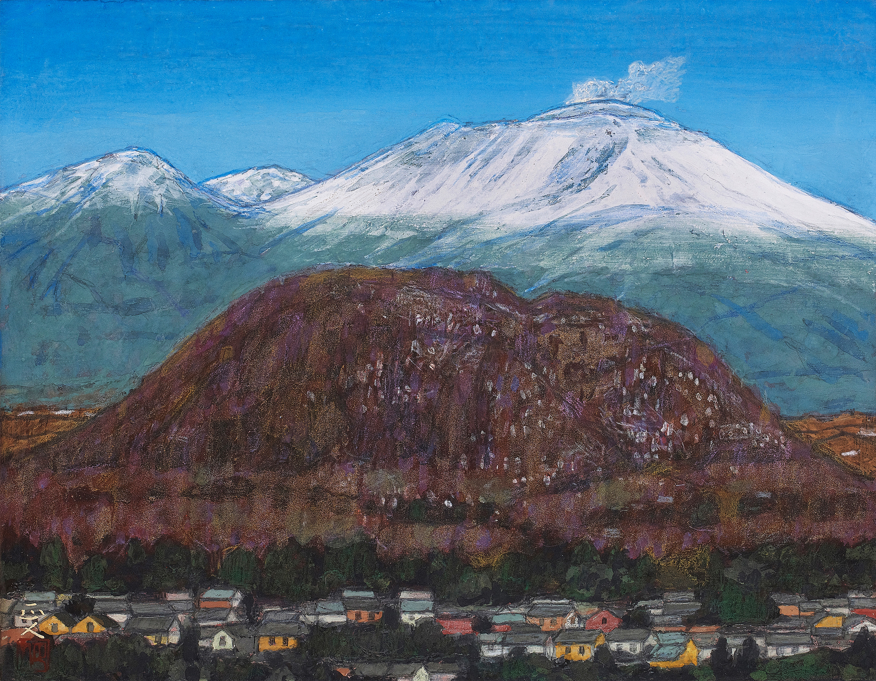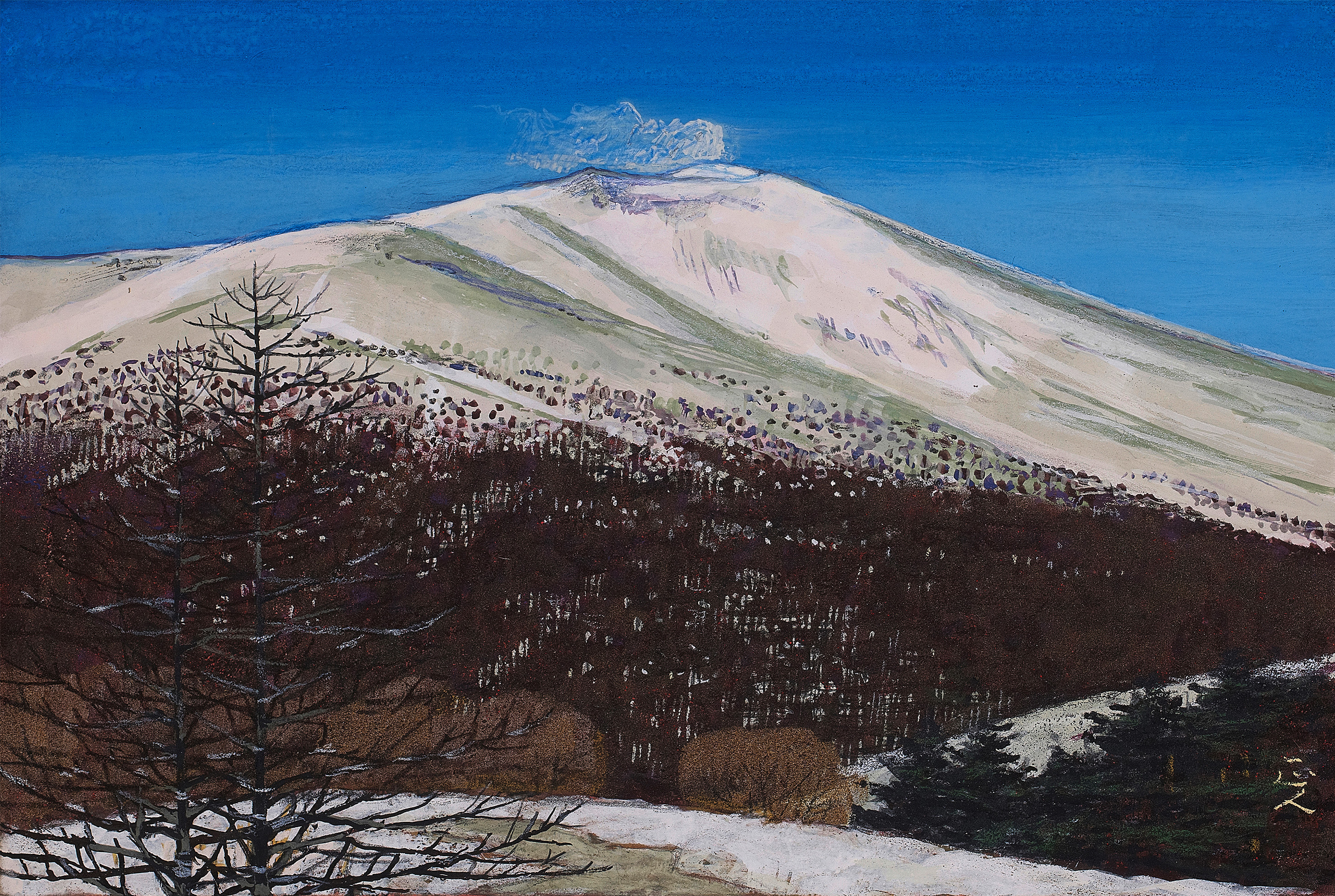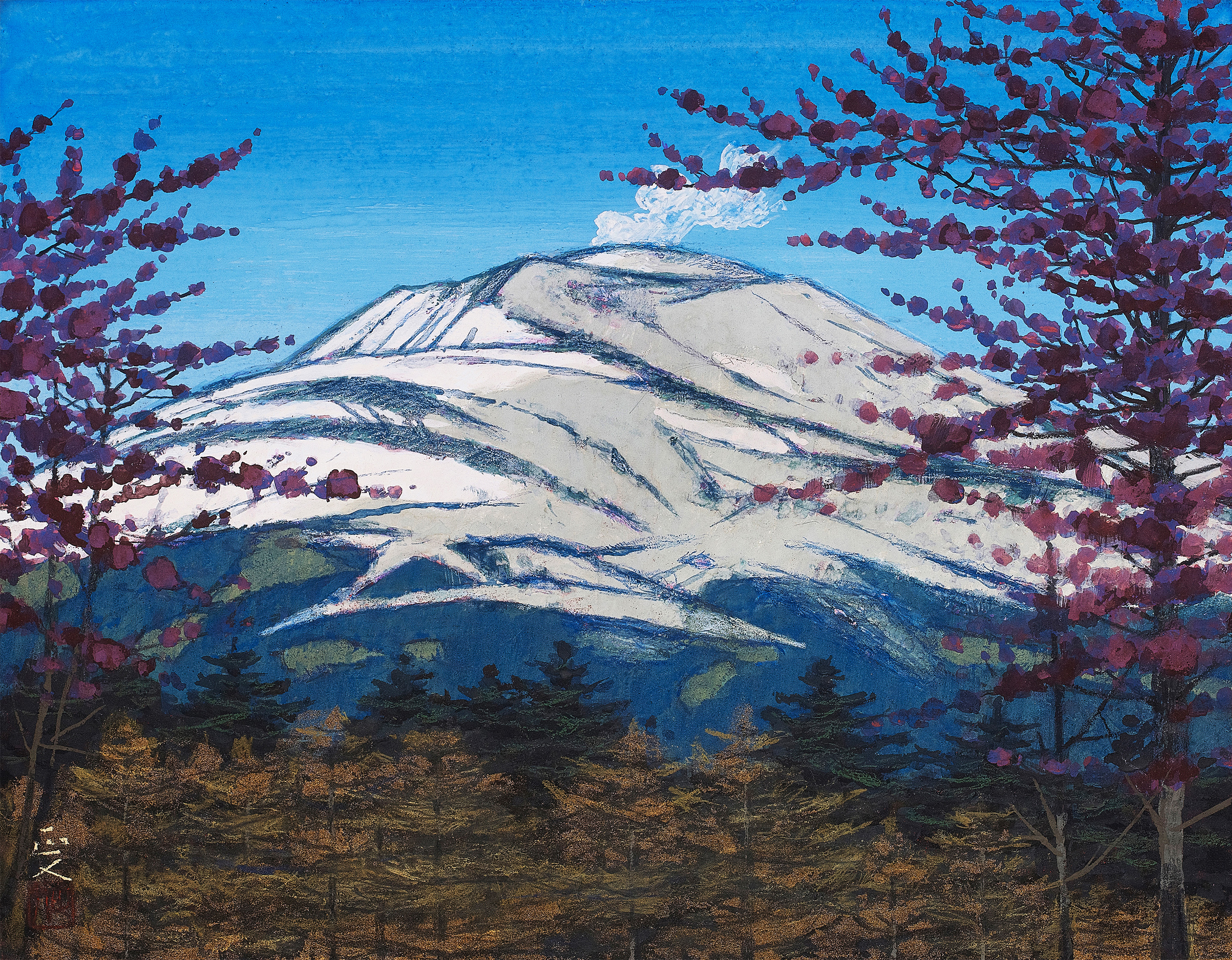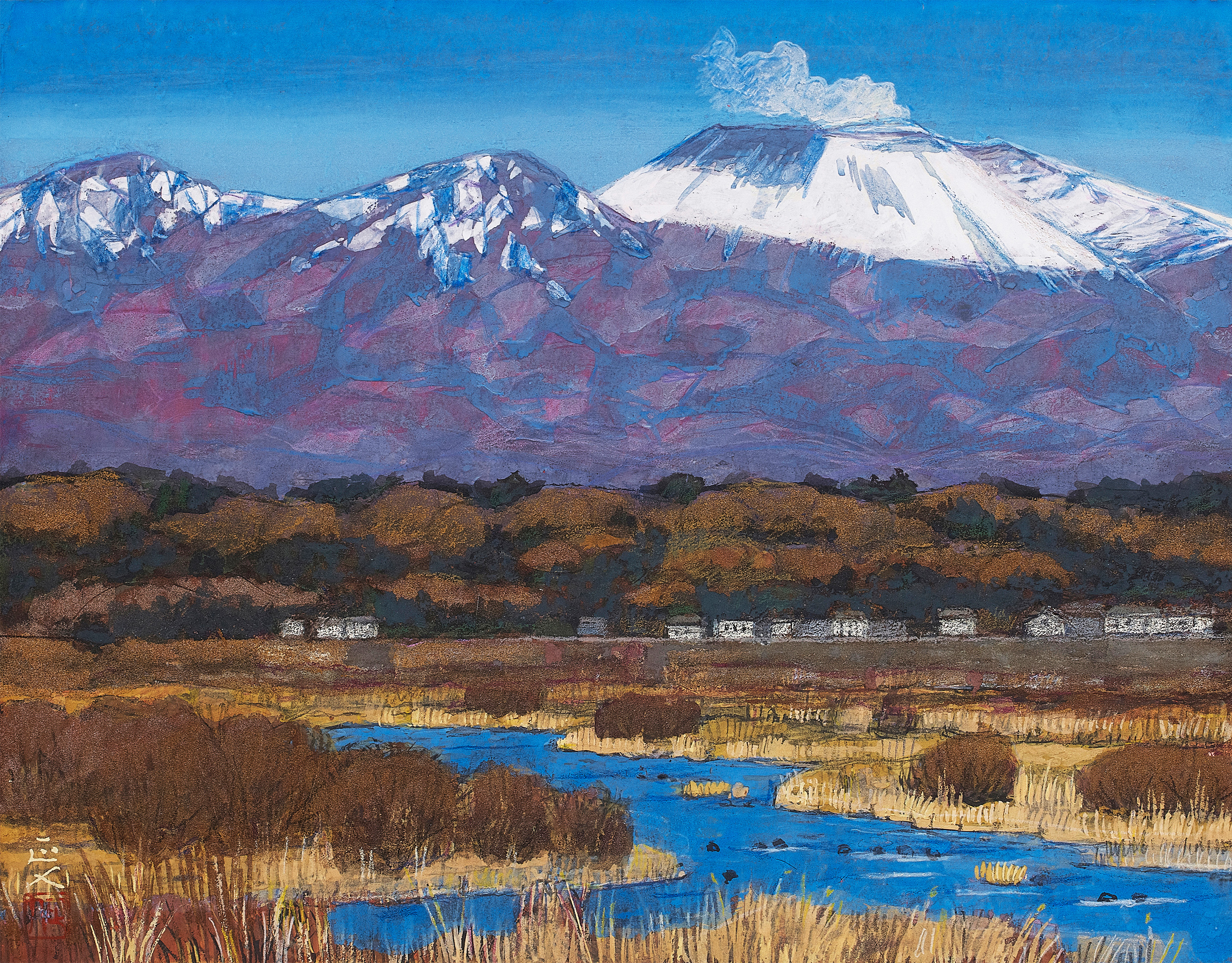 春夏秋冬という季節の移ろい、自然の中に聳える浅間山を描くと同時に風景と人々の営みが描かれている。