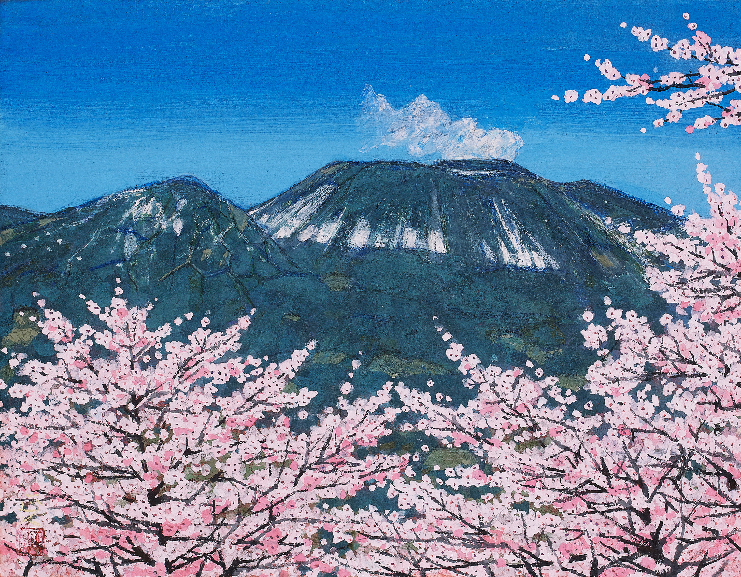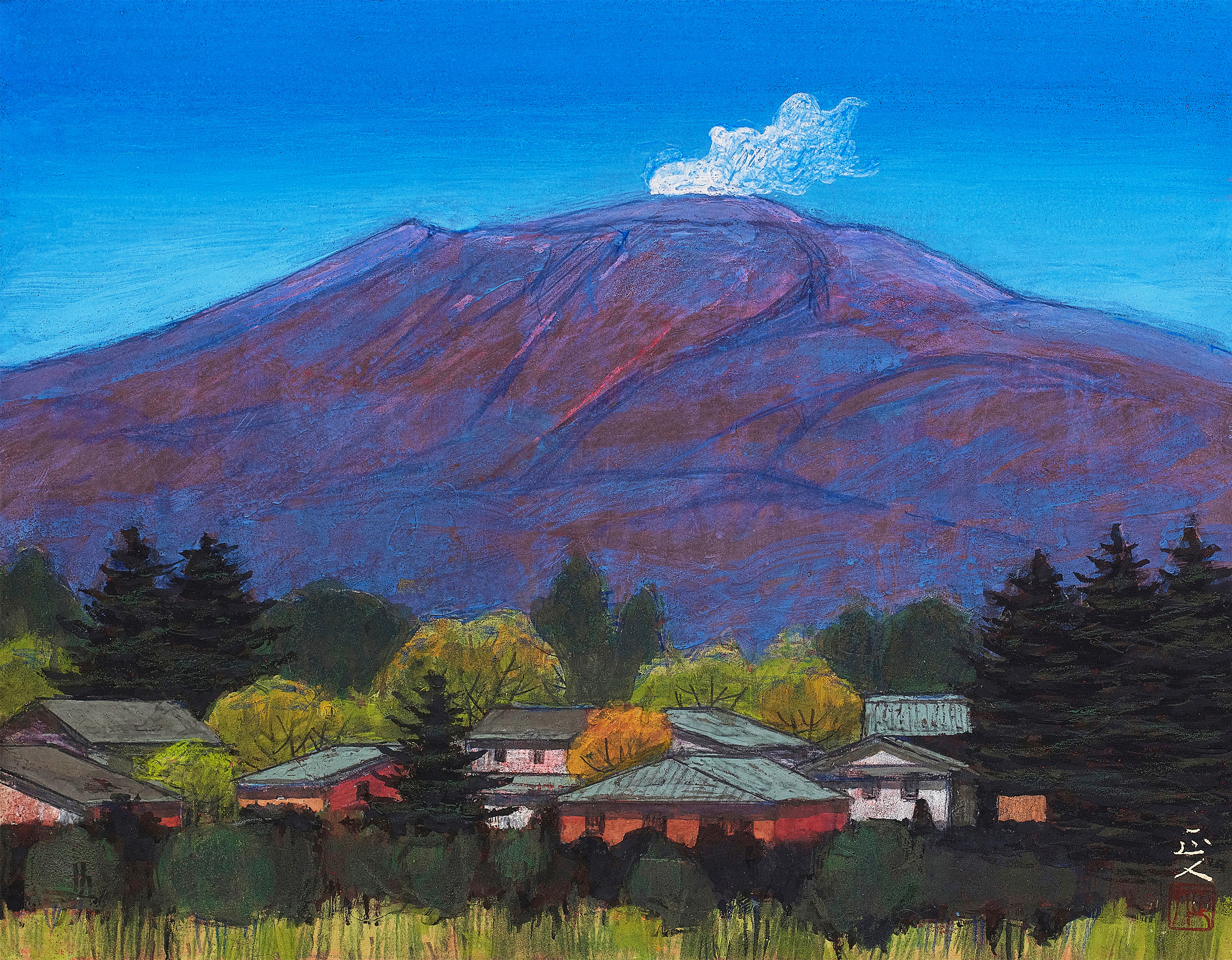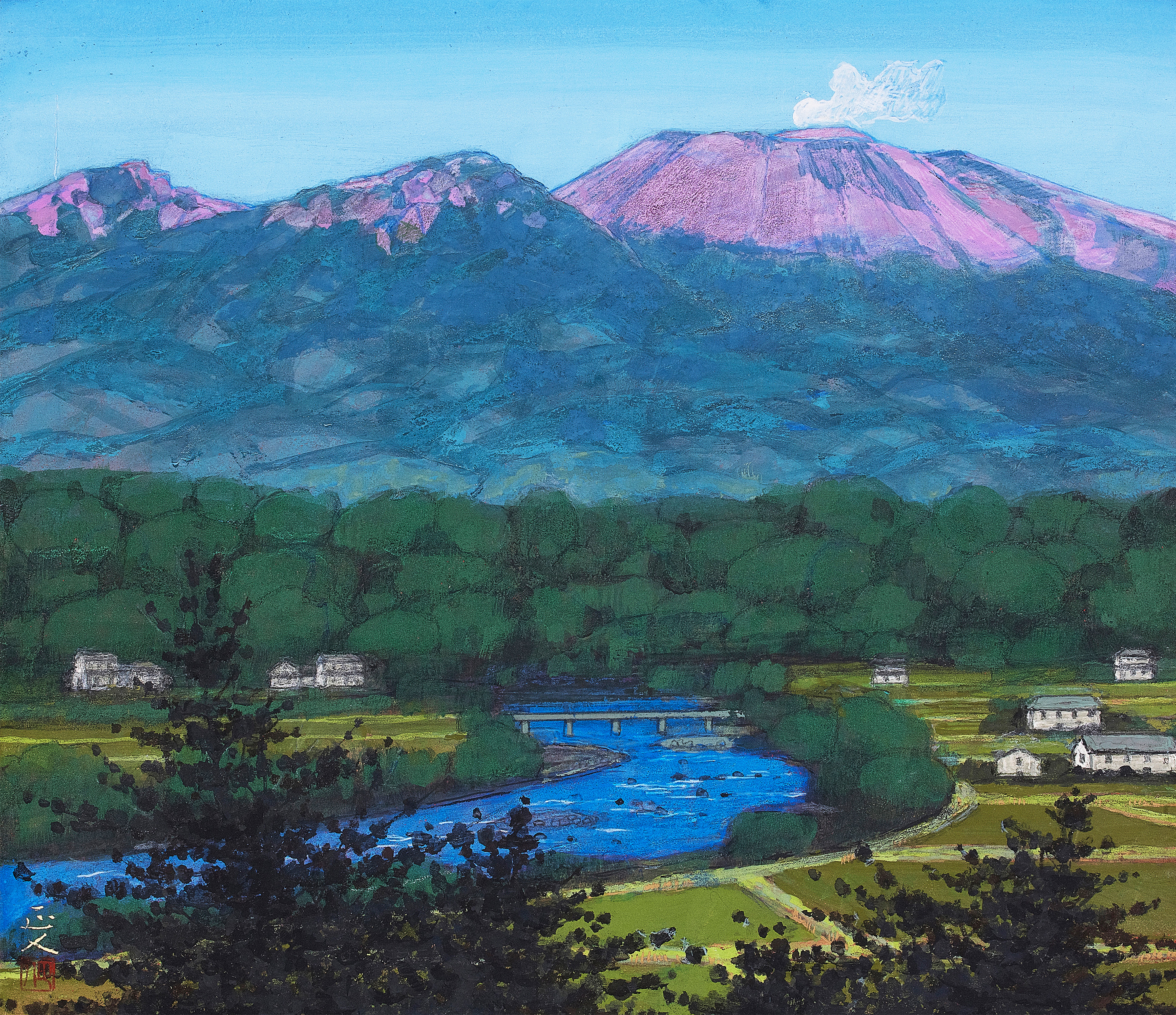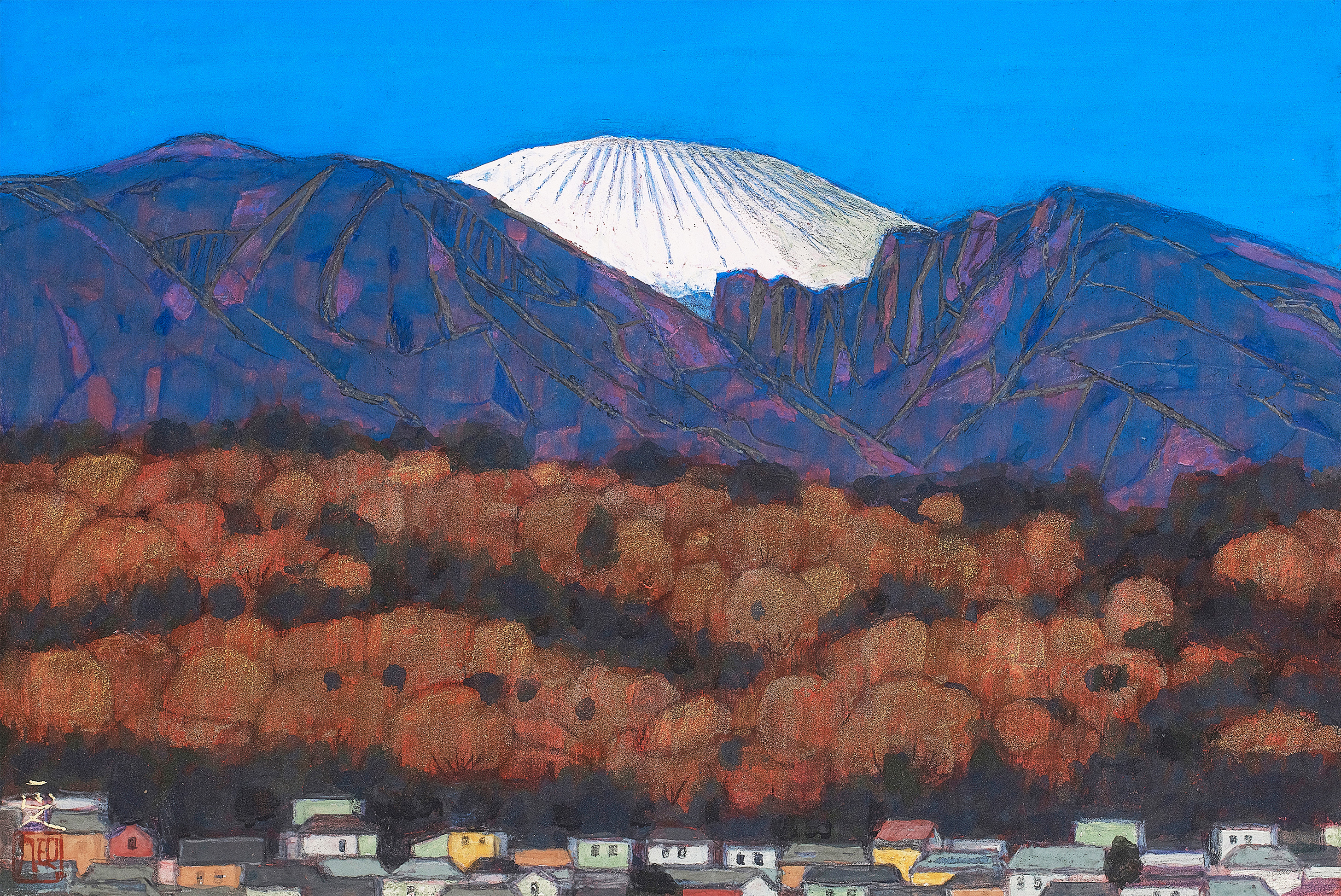 春夏秋冬という季節の移ろい、自然の中に聳える浅間山を描くと同時に風景と人々の営みが描かれている。