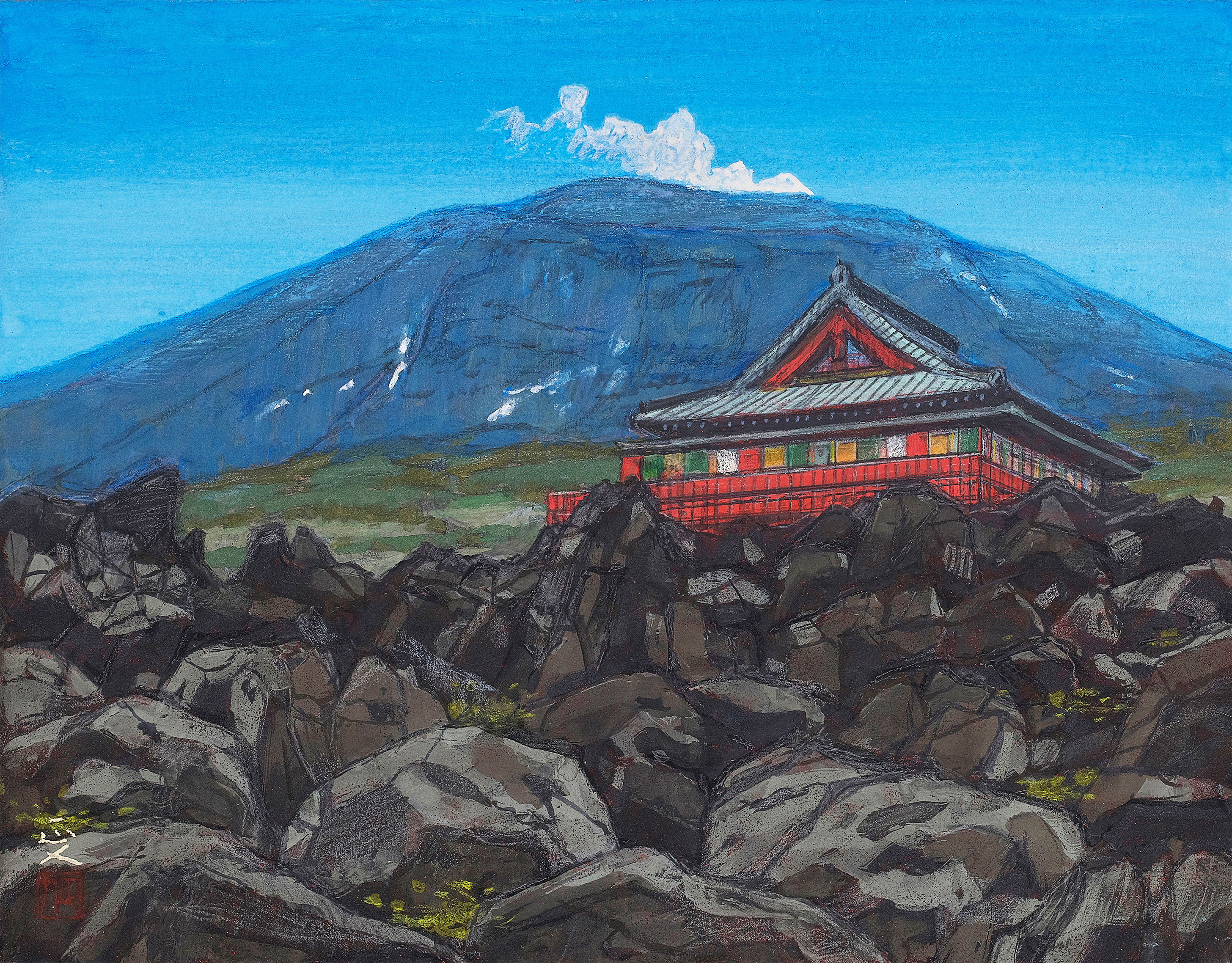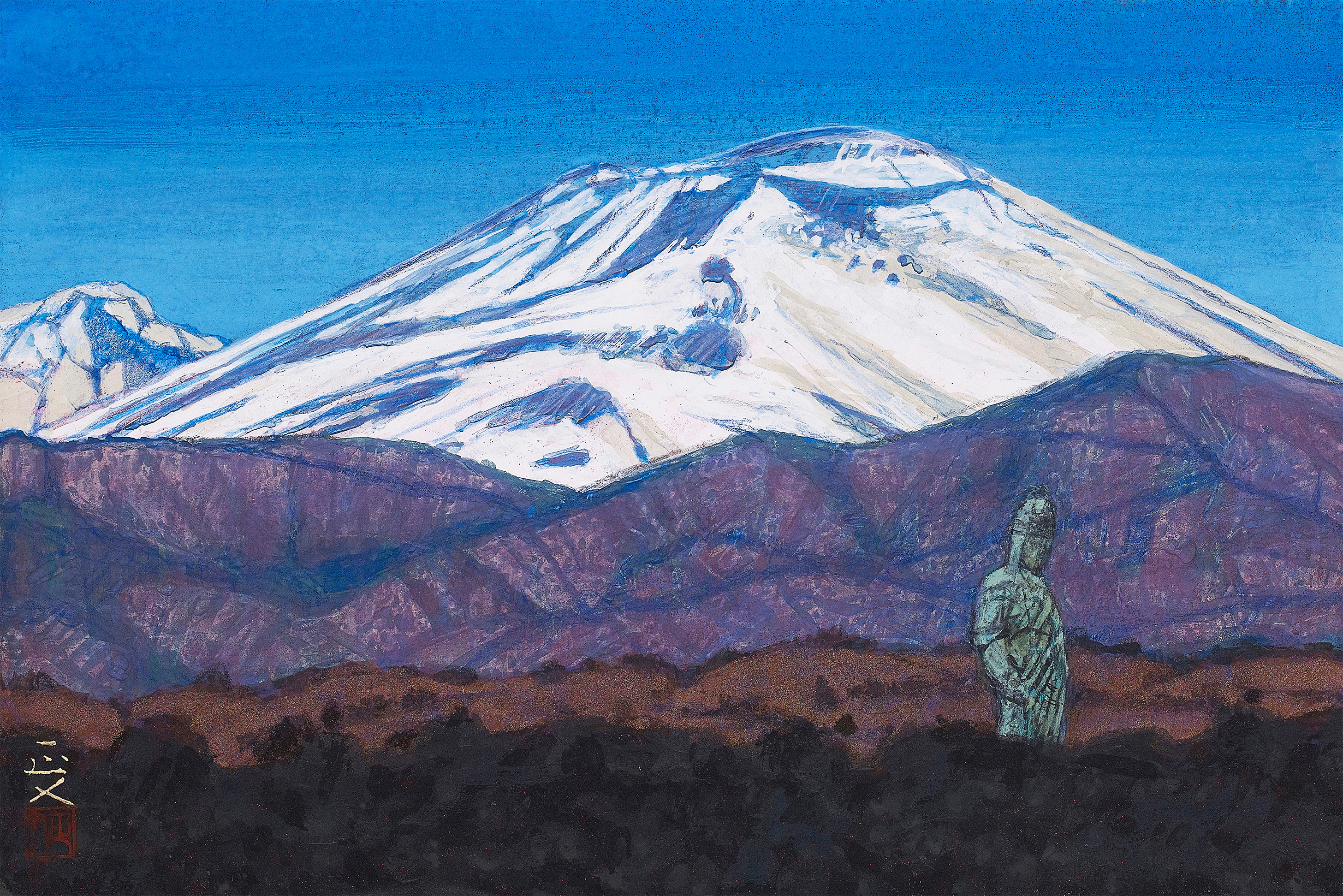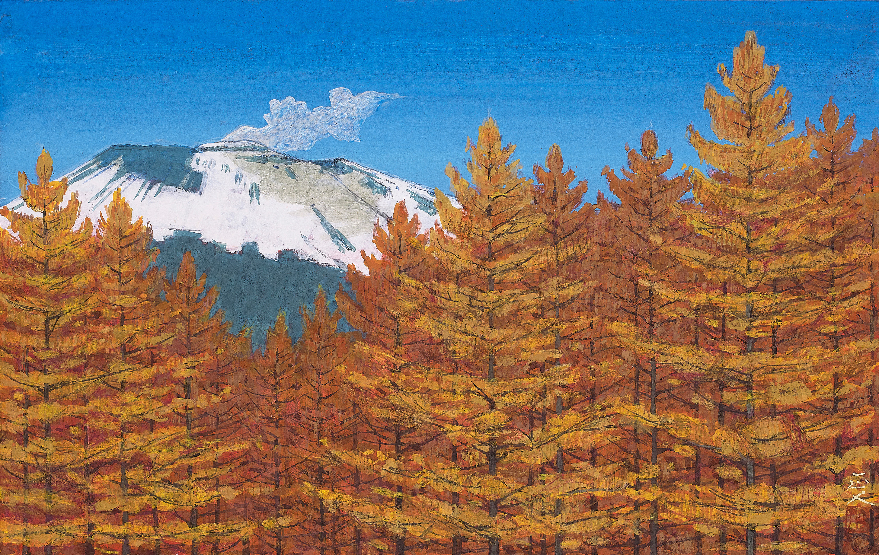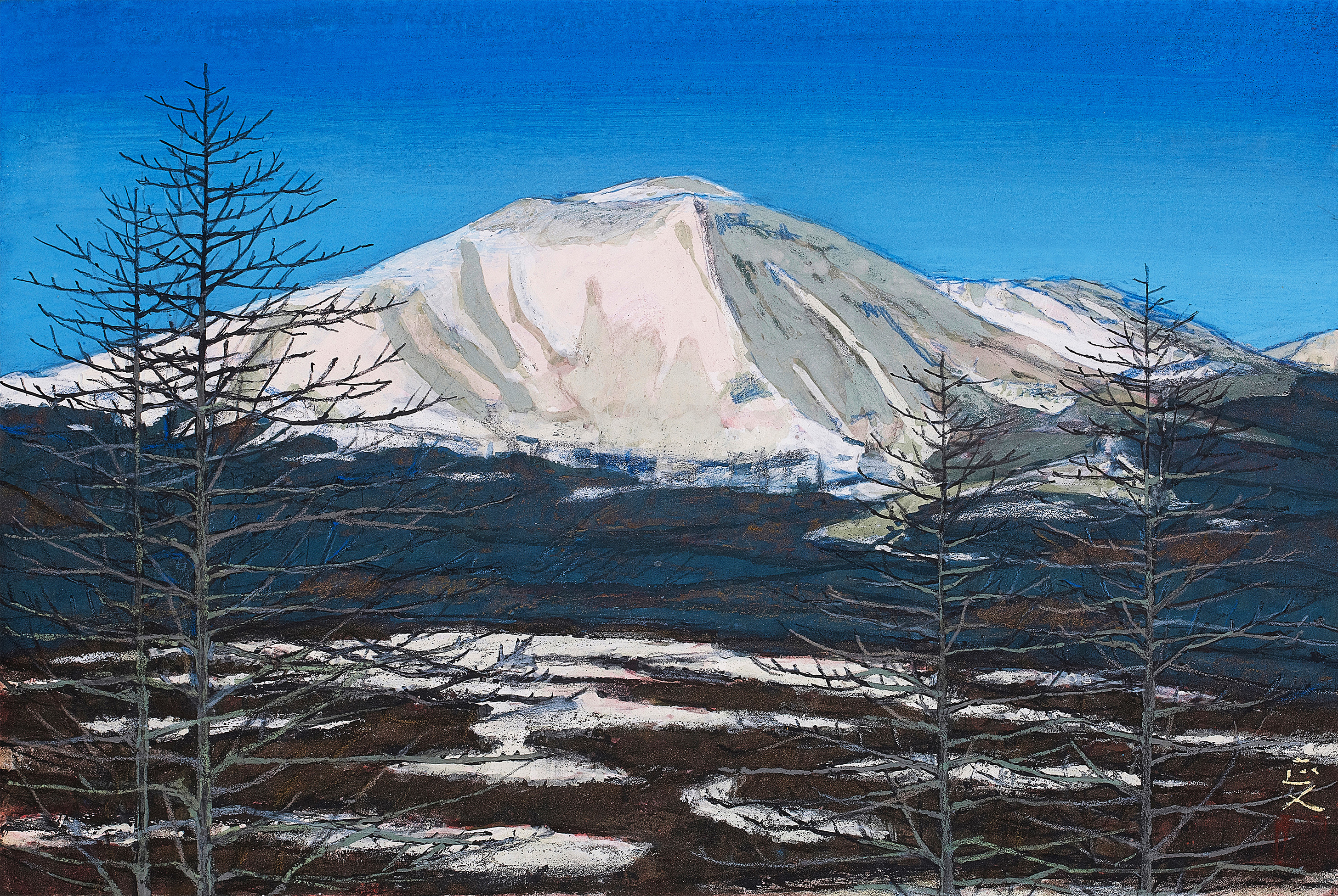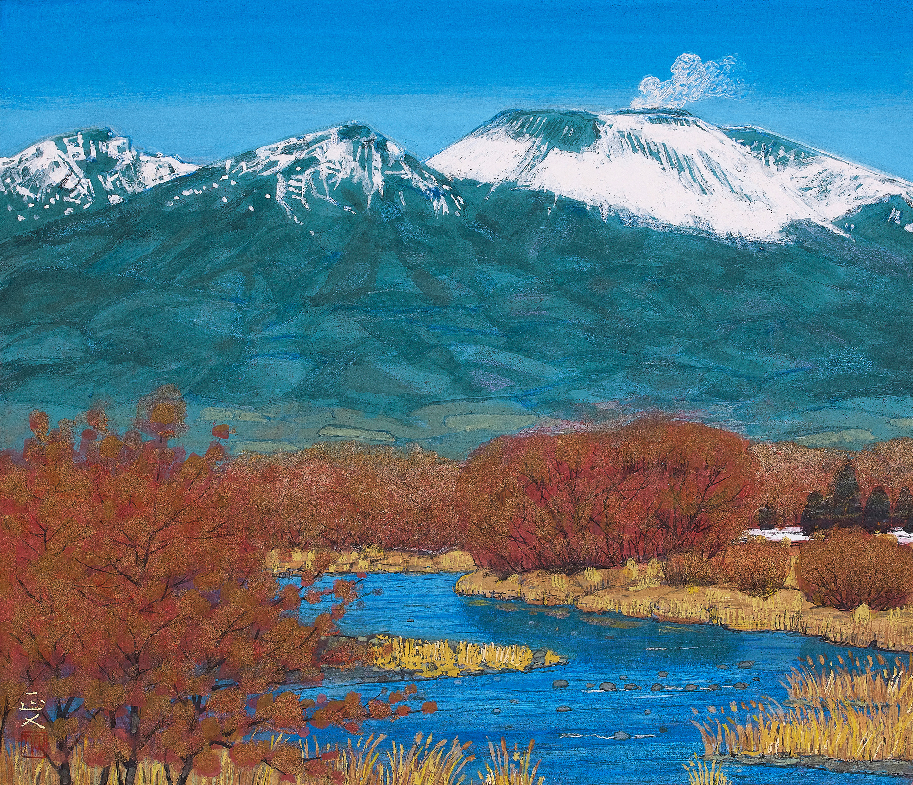 春夏秋冬という季節の移ろい、自然の中に聳える浅間山を描くと同時に風景と人々の営みが描かれている。